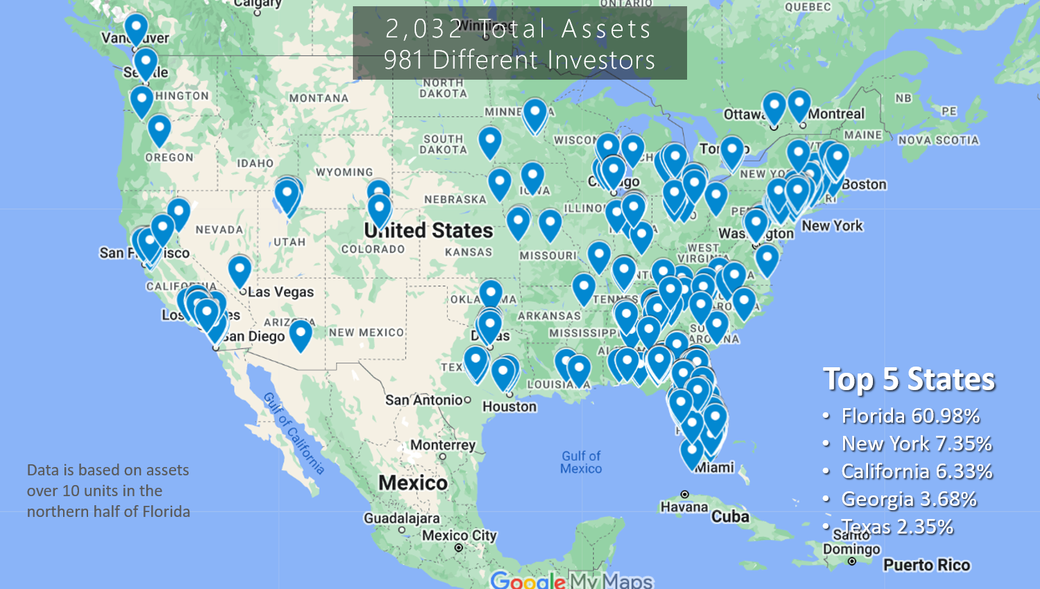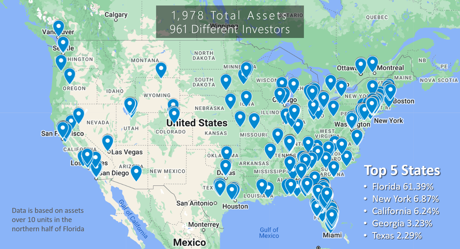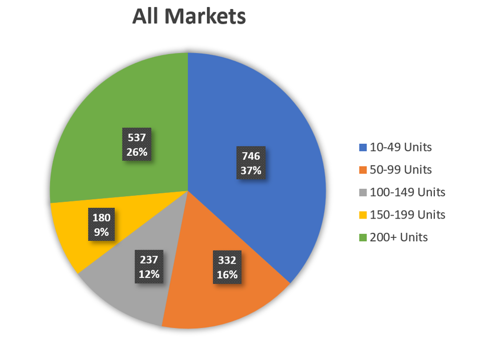 Of all the inventory that exists over 10 units in the markets we cover in the above map 67.96% of the inventory is conventional housing, 11.61% is student, and 20.42% are affordable or senior. Here are some additional stats on the inventory that sold: